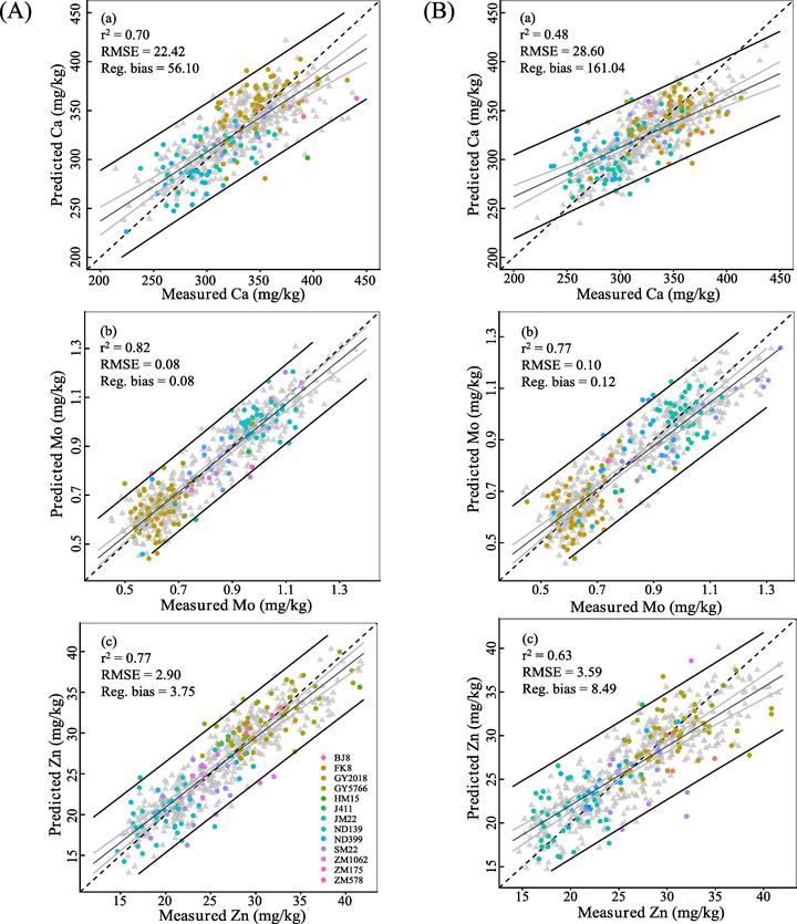 Micronutrients are the key factors to evaluate the nutritional quality of wheat. However, measuring micro-nutrients is time-consuming and expensive. In this study, the potential of hyperspectral imaging for predicting wheat micronutrient content was investigated. The spectral reflectance of wheat kernels and flour was acquired in the visible and near-infrared range (VIS-NIR, 375–1050 nm). Afterwards, wheat micronutrient contents were measured and their associations with the spectra were modeled. Results showed that the models based on the spectral reflectance of wheat kernel achieved good predictions for Ca, Mg, Mo and Zn (r2>0.70). The models based on the spectra reflectance of wheat flour showed good predictive capabilities for Mg, Mo and Zn (r2>0.60). The prediction accuracy was higher for wheat kernels than for the flour. This study showed the feasibility of hyperspectral imaging as a non-invasive, non-destructive tool to predict micronutrients of wheat.